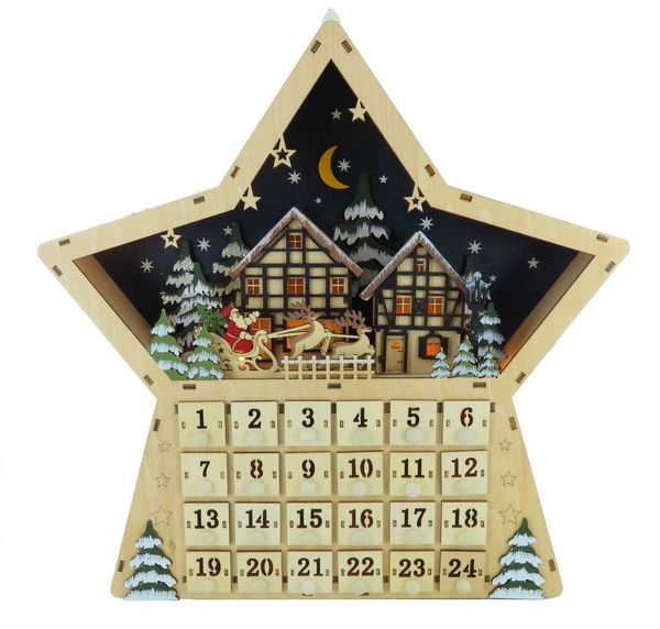 Wooden musical Advent calendar in the shape of a star with Santa